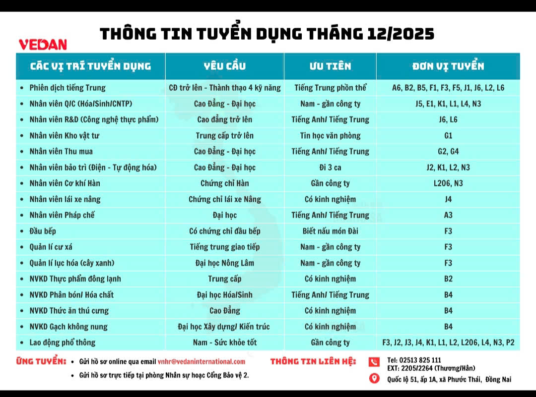 Công Ty VEDAN tuyển dụng nhân viên QC ngành Công nghệ thực phẩm