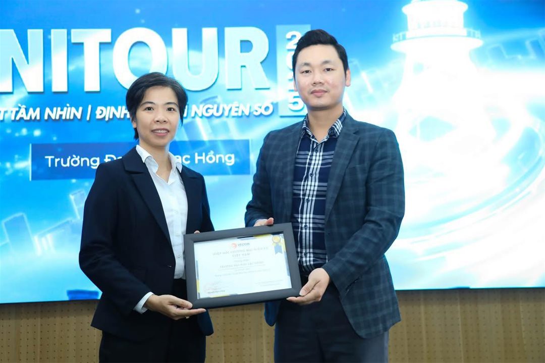Ms. Van Dinh Vy Phuong – Head of the Faculty of Information Technology, receiving the VecomNet Membership Certificate from Mr. Tran Van Trong – Secretary General of the Vietnam E-commerce Association